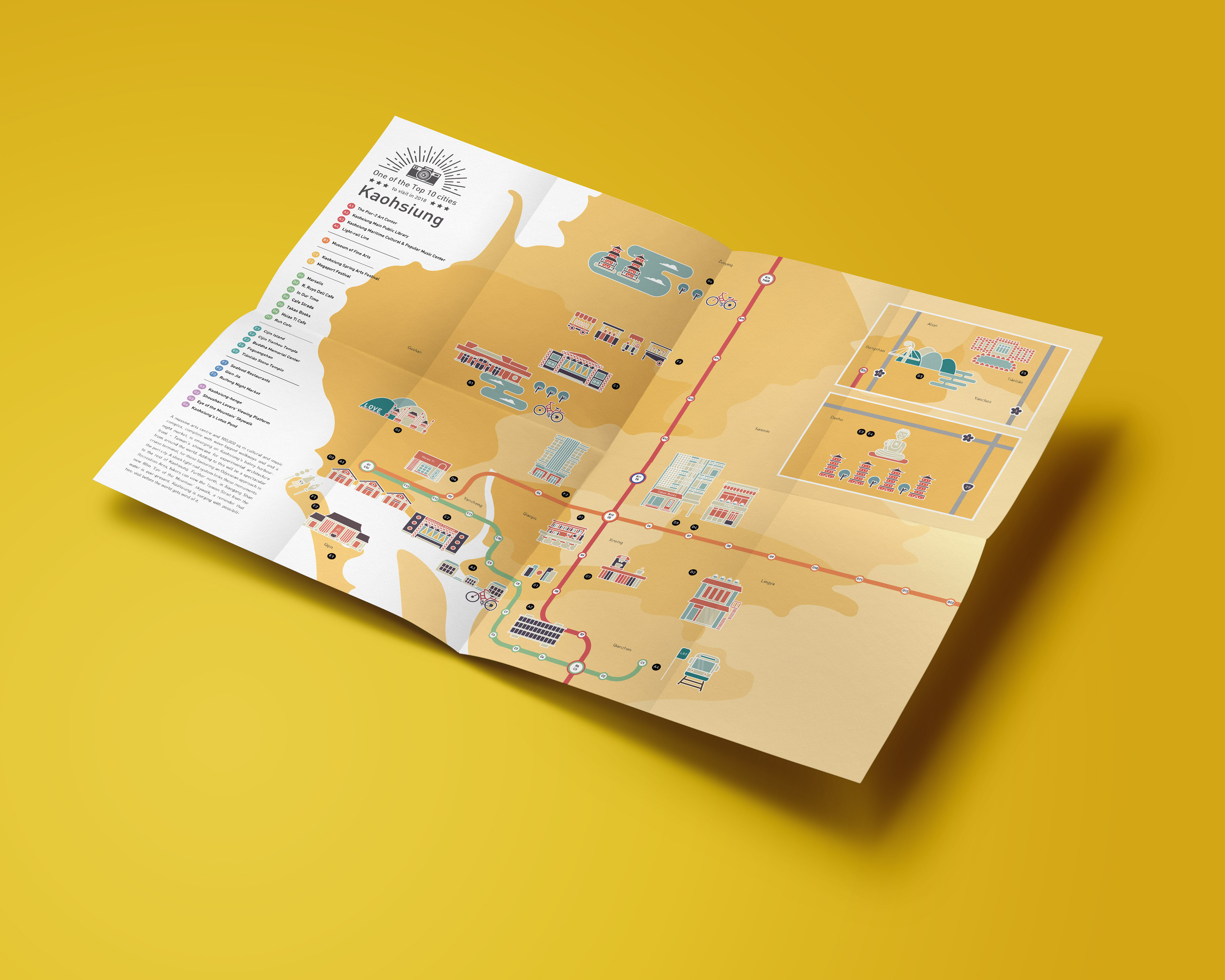 知名旅遊書籍孤獨星球 Lonely Planet,是具參考價值的國際性旅遊指南。高雄於 2018 年被孤獨星球列入全球十大旅遊城市,排行第五,是亞洲唯一入榜城市。高雄是一個藝術、文化和音樂綜合體,此摺頁納入了孤獨星球推薦的景點與美食,以活潑、明亮的色彩表現,為城市注入更多活力,獲得更多國外觀光客關注。